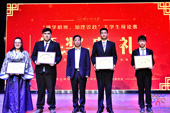 近日,我校“博学明辨,知理识政”大学生辩论赛总决赛暨颁奖典礼在学生发展中心举行。副校长张生勇参加活动并为获奖代表颁奖。外国语学院曹进教授、教育学院王卫军教授、传媒学院任志明教授、马克思主义学院胡好副教授、党委宣传部副部长来鑫华担任评委。党委学生工作部、团委、文学院、地理与环境科学学院相关负责人和师生代表400余人观看了比赛。
