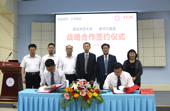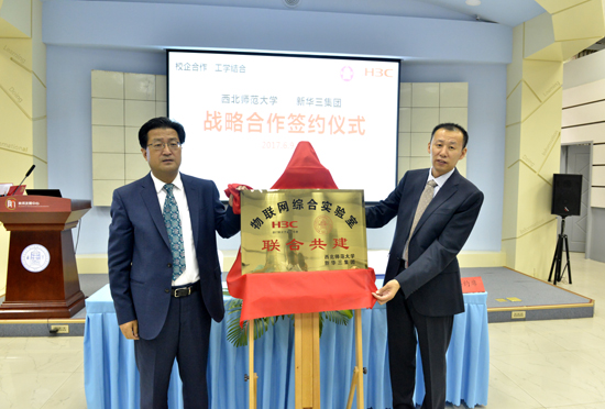 董晨钟、毕首文在仪式上致辞并为西北师大—H3C物联网联合实验室揭牌。计算机科学与工程学院院长党小超代表学校和企业签约。