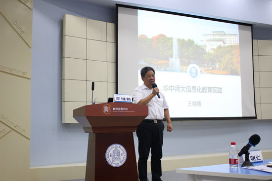 王继新教授作了题为《华中师大信息化教育实践》的报告,分别从背景与规划、环境资源建设与数字教师培养、信息技术与教学深度融合、信息化教育管理、信息化促进社会服务实践、成效与展望等方面做了详细阐述,指出要有创新性的实体空间、虚拟空间、社会组织空间,以信息技术促进学科交叉融合,协同、创新应用。