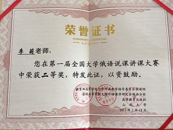 研讨会期间,举办了第一届全国大学俄语说课讲课比赛,李莉副教授经过激烈角逐,荣获二等奖。