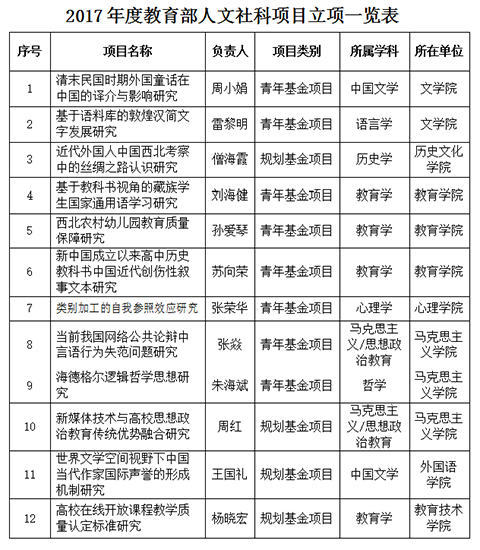 2017年度教育部人文社科项目评审结果公布,西北师大获准12项,居全省高校立项单位之首。