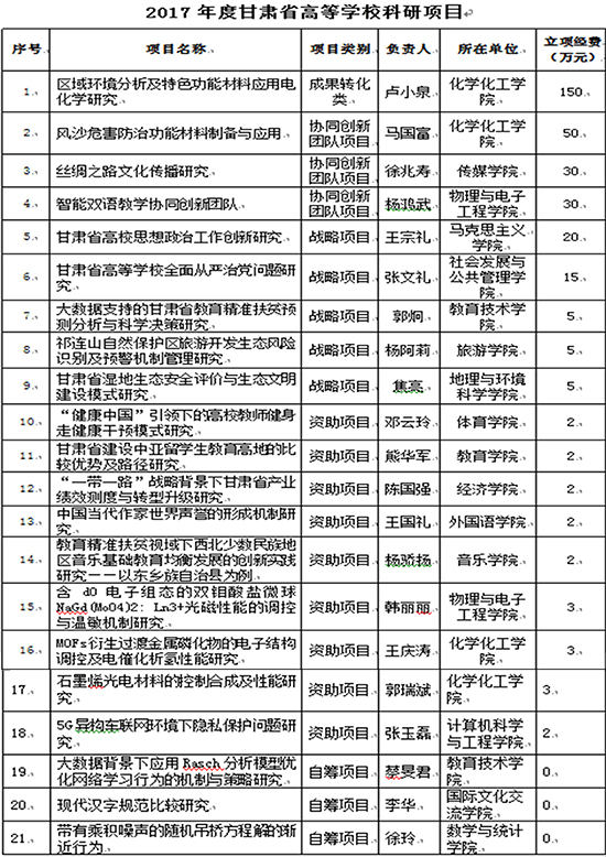 近日,2017年度甘肃省高等学校科研项目下达,西北师大获准21项,其中协同创新团队项目3项,科技成果转化类1项,战略项目5项,一般项目9项,自筹项目3项。