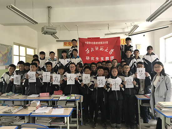 西北师大第六届“中国青年志愿者扶贫接力计划”研究生支教团的12名志愿者们分别在甘肃省武威市天祝藏族自治县第二中学、定西市陇西县通安中学和通渭县陇山学校,以不同形式学习了党的十九大精神,用实际行动续写着西部志愿者的青春篇章。