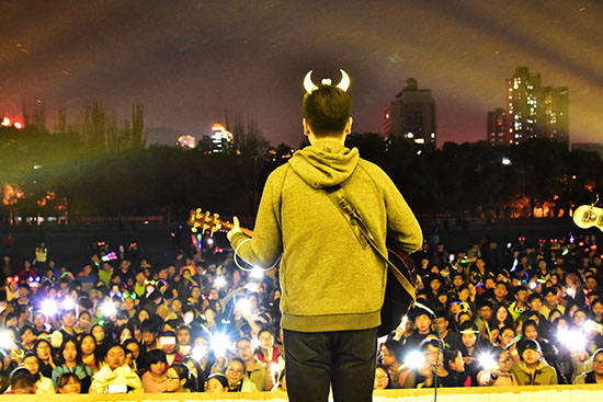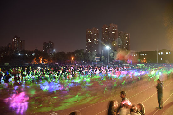 当晚,佩戴荧光头饰和荧光棒的同学们,伴随着大学生艺术团带来的动感音乐,或独自享受运动的喜悦,或与同伴在欢声笑语中分享交流。音乐、荧光、欢笑声相交融,同学们奔跑在西操场的身影汇成冬日校园里最美丽的风景线。