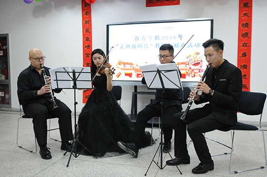 晚会在悠扬的小提琴、单簧管、萨克斯合奏中拉开帷幕。“走进新时代——教育学院2017年工作掠影”视频回顾了2017年教育学院人才培养、科学研究、社会服务走过的路,取得的成绩。合唱《绒花华》《好人好梦》、独唱《梨花颂》、游戏《争分多秒》《团结一致》《数字抱团》、诗朗诵《沁园春•雪》、萨克斯独奏《I believe》、猜字谜等精彩节目,展示了大家团结一心、勇闯佳绩的精神风貌。