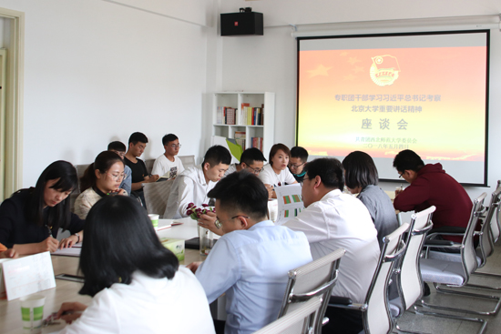 近日,西北师大专职团干部认真学习习近平总书记在北京大学师生座谈会上的重要讲话精神。大家一致表示,习近平总书记的讲话体现了我们党始终代表广大青年、赢得广大青年、依靠广大青年的远见卓识,体现了我们党领袖的深邃历史眼光和战略眼光,体现了青年工作事关党和国家全局和未来的特殊地位,是对广大青年的巨大鞭策,也是对广大团干部的极大鼓舞。