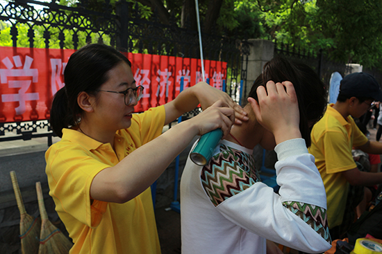 各学院后援队率先担负起运动会现场的服务职责。传媒学院的后勤人员杨森瑞说:“搬桌凳、撑帐篷、公示赛程安排、引导运动员入场以及维持签到纪律是我们作为学院后援队在运动会期间需要进行的日常工作。”教育学院郭诗怡正在更新赛事进度表,“我们一共有七个小伙伴负责学院的后援工作。全部随时待命,只要有需要的地方就上。”