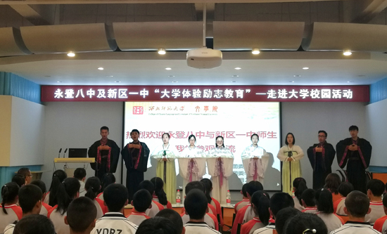 在联谊交流活动中,文学院学生马勺勺、雷燕和大家分享了自己大学生涯的感悟和体会,“子衿”诗社表演了中国古典诗词吟诵,两所中学学生也献上了他们自编自导的精彩舞蹈,参加活动的大、中学生并就学习和未来规划作了互动交流。