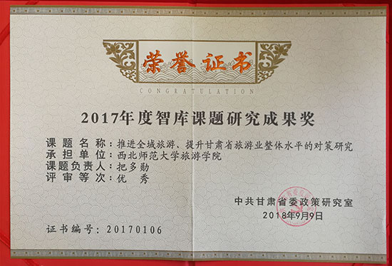 近期,西北师大旅游学院把多勋教授承担的《推进全域旅游,提升甘肃省旅游业整体水平的对策研究与建议》调研报告获甘肃省委政研室“2017年度智库课题研究成果奖”。