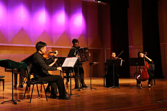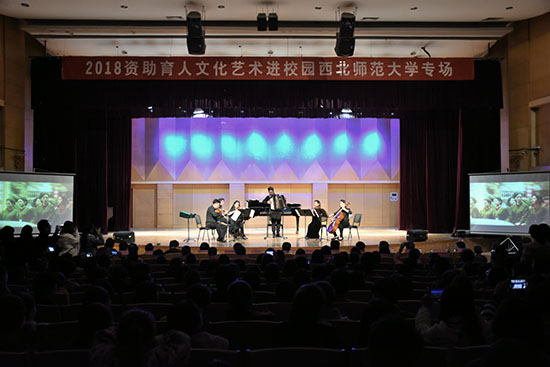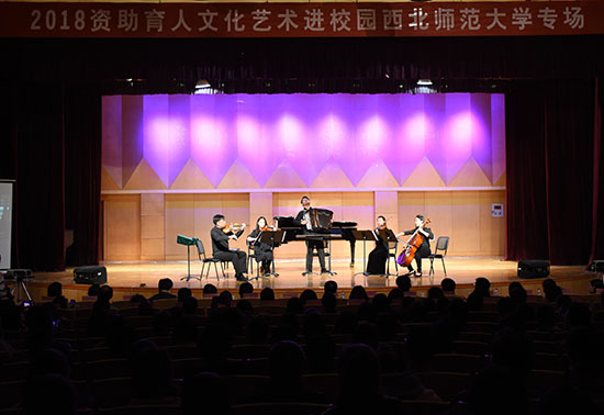 10月30日,全国“资助育人 文化艺术进校园”走进西北师大,来自西区爱乐室内乐团的6位艺术家为师生带来了一场音乐盛宴。甘肃省学生资助管理中心主任薛志强,西北师大副校长张生勇和党委宣传部、党委学生工作部、音乐学院负责人,各学院辅导员及受资助学生代表400余人欣赏了音乐会。