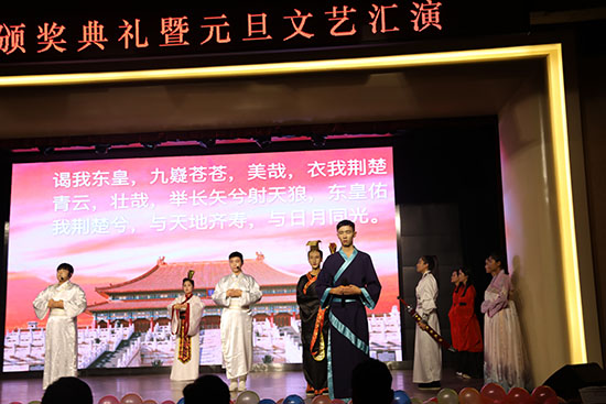 同学们演唱了《镜像》《你最珍贵》《种树》等歌曲,表演了舞蹈《天线宝宝抖起来》《美丽的姑娘》《缘定萨玛志》《Seve samsara》、小品《白蛇前传》、话剧《汨罗魂》、器乐演奏《赛马》等精彩节目。全体教职工演唱的大合唱《中国,中国,鲜红的太阳用不落》《众人划桨开大船》将晚会推向高潮,体现了师生积极进取、昂扬向上的精神风貌。
