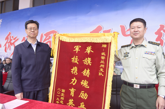大会在庄严的国歌声中拉开帷幕,刘仲奎代表学校向武警兰州支队赠送锦旗。学校授予54名同学“2019级本科学生军训优秀学员”荣誉称号,授予12名教官“2019级本科学生军训优秀教官”荣誉称号,并进行表彰奖励。