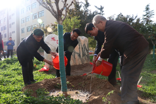 9时许,西北师大校领导、校友代表、教师代表、学生代表齐聚新校区,为思政校友林揭牌,为象征着思想政治教育专业历史与未来的树木培土浇水。