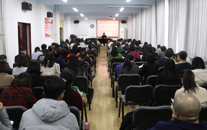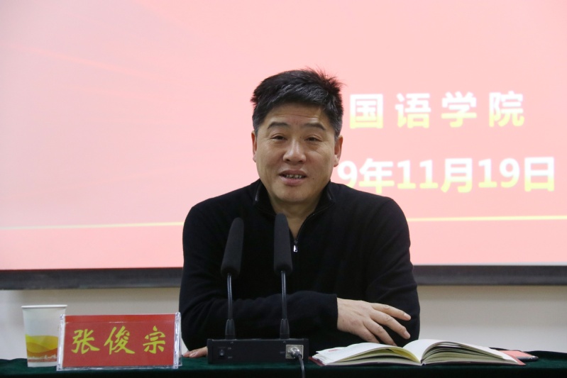 11月19日下午,党委书记张俊宗来到外国语学院调研,为全体教师、学生党员讲授主题教育专题党课。