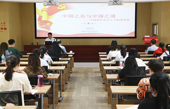 当天下午,张俊宗以《中国之治与中国之道:中国特色社会主义制度优势》为题为学生们讲授思政课。授课过程中,张俊宗以“为什么”“是什么”“做什么”的问题链方式,层层深入、由浅入深地阐述了为什么要重视制度建设,中国特色社会主义制度的优越性是什么以及需要做什么来加强中国特色社会主义制度三个方面的问题,启发引导大学生们充分认识坚持和完善中国特色社会主义制度、推进国家治理体系和治理能力现代化的重要意义,深刻领会中国特色社会主义制度和国家治理体系的显著优势,坚定中国特色社会主义制度自信,准确把握坚持和完善中国特色社会主义制度、推进国家治理体系和治理能力现代化的总体要求、总体目标和重点任务。