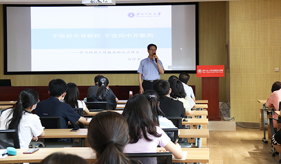 当天上午,刘仲奎以《于危机中育新机 于变局中开新局》为题,围绕“GDP增速”“就业”“财政政策和货币政策”以及“大循环、双循环”四个主题与大学生们分享了学习2020年政府工作报告的认识体会。刘仲奎结合当前国内外形势发展变化以及疫情防控时期的特殊性,深入浅出地引导大学生们正确认识国家提出优先稳就业保民生,坚决打赢脱贫攻坚战,努力实现全面建成小康社会目标任务的重要意义,并综合运用数学、经济学的思维分析方法,帮助他们理解国家实施宏观经济调控政策的深刻内涵。刘仲奎希望同学们在刻苦学习的同时进一步拓宽情怀和视野,在关注社会发展的同时学会理性地思考分析问题,以积极进取的姿态在新时代的大舞台上绽放青春光华。