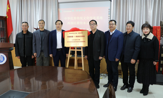 西北师大副校长田澍教授,兰州城市学院副校长莫超教授,甘肃省民族音乐研究中心主任、甘肃省学校艺术指导委员会常务副主任孔庆浩教授,甘肃省民族音乐研究中心副秘书长、兰州城市学院音乐学院副院长李琪教授,甘肃省民族音乐研究中心办公室主任曹国梁等专家出席仪式,西北师大第二附属中学教师参加仪式。田澍、莫超共同为“中华优秀传统文化传承基地西部民歌传承示范学校”揭牌。