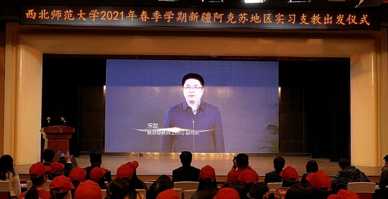 314日,西北师大举行2021年春季学期赴新疆实习支教启动仪式。副校长董晨钟出席启动仪式并讲话,教务处、招生就业处、党委学生工作部、音乐学院负责人,新疆实习支教全体指导教师、学生代表200余人参加启动仪式。教育部教师工作司副司长宋磊以远编视频录像形式寄语师生。