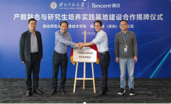 325日,西北师大教育技术学院应邀赴腾讯科技(深圳)有限公司举行产教融合与研究生培养实践基地建设合作揭牌仪式。教育技术学院负责人,腾讯科技(深圳)有限公司腾讯云副总裁、腾讯教育副总裁王涛代表双方揭牌。