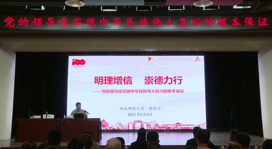 5月6日下午,西北师大举行党史学习教育思政理论报告会,党委书记、学校党史学习教育领导小组组长张俊宗出席并为师生党员代表作题为《明理增信 崇德力行——党的领导是实现中华民族伟大复兴的根本保证》专题辅导报告。副校长邓小娟主持报告会,党委学生工作部、团委相关负责人及全体辅导员、学生党员代表参加报告会。