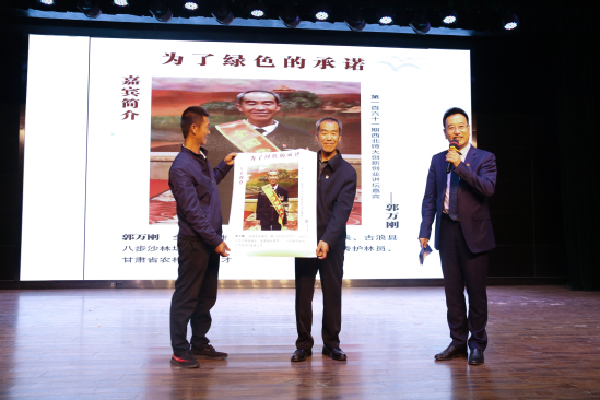 郭万刚用朴实无华的语言深情地讲述他40多年来的治沙故事。作为全国荒漠化重点监测县古浪县八步沙林场的治沙能手,郭万刚自父亲手中接过治沙铁锹之后,就再没有离开过八步沙。本着“沙漠不退人不退,草木不活人不走”的决心,他用自己的双手不断践行绿色的诺言,带领林场治沙人,靠“一棵树、一把草,压住沙子防风掏”这种简单而传统的治沙方式,让黑岗沙等地的千年沙患得到了有效治理,为治理当地生态环境作出了非凡的贡献。在讲到沙患曾夺取过年幼孩子的生命时,他不禁潸然泪下。“为了子孙后代”是郭万刚治沙四十年中最淳朴的动力,他迫切希望古浪人民能在熟悉的家园安居乐业,子孙后代能在脚下的土地茁壮成长,正是因为这个平凡的希望,每一代治沙人才能坚持不懈地走出不平凡的治沙之路。他说:“自然灾害确实很可怕,但只要坚定决心,坚持不懈地治理下去,相信总有一天,黄沙会变成黄金,风沙会变成风景!”