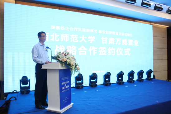 刘仲奎在致辞中表示,近年来,西北师大以智库服务、教育培训、成果转化、教育资源输出、文化资源开放为主要内容,不断促进开放办学,和一批具有社会责任感的优质企业建立了合作关系,取得了良好成效。在“十四五”的开局之年,中国共产党成立100周年,在这个重要的历史交汇期,双方有缘携手,共同签署战略合作协议,标志着双方开展多层次、多形式、多领域合作的开始,为共同探索教育研究与城市建设共融发展的全新模式迈出了实质性的关键一步。希望双方以此次签约为新起点,优势互补、协同创新,构建产学研深度融合和协同发展新模式,务求实效,合作共赢,树立新时代校企合作的标杆。