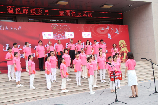 老年大学各教学班在学校博物馆广场演唱了《唱支山歌给党听》《映山红》《党啊、亲爱的妈妈》《永远跟党走》《今天是你的生日、中国》《我和我的祖国》等歌颂党、歌颂祖国的经典歌曲,表达了离退休职工热爱党、热爱社会主义祖国,听党话、跟党走的坚定决心。