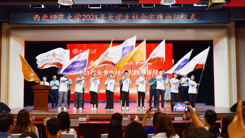 仪式上,团委负责人介绍了2021年大学生社会实践基本情况。与会领导为实践团队授旗。心理学院教师朱雅雯、生命科学学院2020级学生陈蓉分别代表指导教师和实践队员发言。