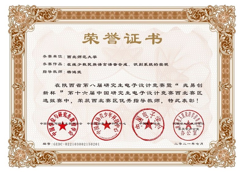 近日,由教育部学位与研究生教育发展中心指导,中国科协青少年科技中心、中国电子学会共同主办的第十六届中国研究生电子设计竞赛全国总决赛举行。西北师大杨鸿武教授指导,硕士生李栋、张静一、王思龙设计开发的作品“在线少数民族语言语音合成、识别系统的实现”荣获全国总决赛团队二等奖,杨鸿武荣获西北赛区优秀指导教师。