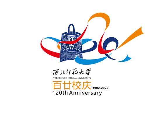 校庆标识基本构图以象征师大徽识的木铎和象征黄河及丝绸之路的红、黄、蓝三色飞天飘带等中国传统文化元素组成。