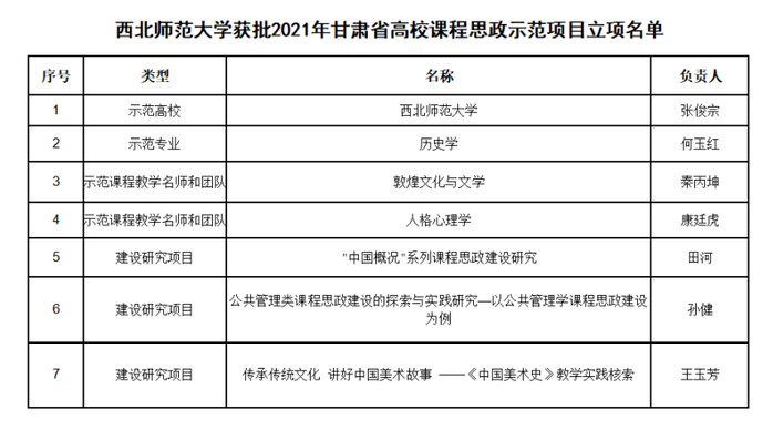近日,甘肃省教育厅公布了2021年甘肃省高校课程思政示范项目立项名单,西北师大入选甘肃省课程思政示范校。同时,学校历史学入选示范专业,敦煌文化与文学、人格心理学入选示范课程教学名师和团队,《“中国概况”系列课程思政建设研究》《公共管理类课程思政建设的探索与实践研究——以公共管理学课程思政建设为例》《传承传统文化 讲好中国美术故事——<中国美术史>教学实践探索》入选建设研究项目。