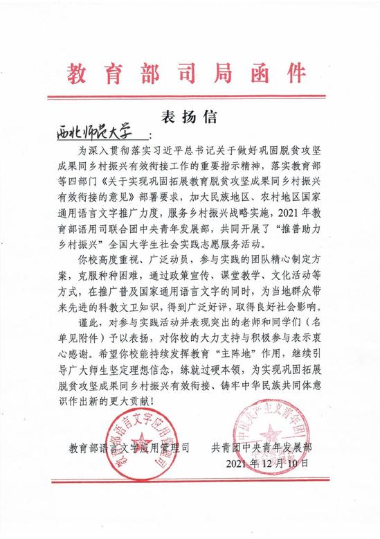 信中提到,在2021年“推普助力乡村振兴”社会实践活动中,西北师大商学院深入贯彻落实习近平总书记关于做好巩固脱贫攻坚成果同乡村振兴有效衔接工作的重要指示精神,积极响应号召,高度重视、广泛动员,精心制定方案,克服种种困难,在推广普及国家通用语言文字的同时,为当地群众带来了先进的科教文卫知识,得到广泛好评,取得良好的社会影响,希望学校能持续发挥教育“主阵地”作用,为实现巩固脱贫攻坚成果同乡村振兴有效衔接、铸牢中华民族共同体意识作出新的更大贡献。