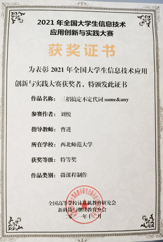 近日,西北师大教育硕士刘悦制作的微课“三招搞定不定代词some & any”获全国高等学校计算机教育研究会新科技与继续教育分会举办的“2021年大学生信息技术应用创新与实践大赛”特等奖,西北师大曹进教授获优秀指导教师奖。