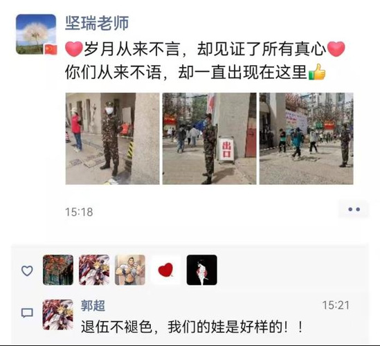 队员们认真执勤的身影也常常出现在“兵妈”坚瑞的朋友圈里,坚瑞说:“作为负责这群娃娃们的老师,我有时看着他们既自豪又心疼。就算不在部队,娃们也从来没有放松对自己的要求,值班站岗身体站得笔直,一站就是一个多小时,因为工作难以吃上一口热乎饭,都是自己的孩子,怎么能不心疼。但我知道,在他们眼里,疫情就是命令,防控就是责任。我能做的,就只有默默鼓励和加油。”