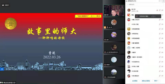 3月26日,外国语学院“心语堂”心灵瑜伽——“咱们一起聊聊天”首期上线。院长曹进教授担任主聊嘉宾,和师生畅谈师大故事。曹进通过一张张珍贵的师大照片,结合自己在师大求学、留校工作和生活30余年的经历,以幽默、感人、严谨的口吻讲述师大故事,让大家在聆听中感受学校的历史变迁。