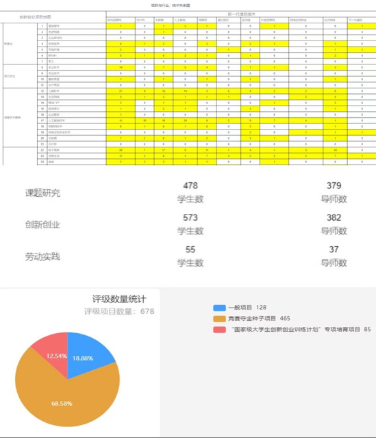 根据学校对防疫工作的部署和安排,坚持居“舍”研学不懈怠,创新创业学院积极开发可视化平台在线上对学生“创新创业能力提升计划”项目开展动态监测,借助创新创业项目管理APP对327个课题研究类项目、326个创新创业类项目、29个劳动育人实践类项目进行日常管理,规定项目组成员定期上报项目进展周报,对进展较好、成果较显著的项目周报做公开展示,本学期4次周报填写以来,共评选出200余份优秀周报供研究团队学习,督促学生在遵守防疫规定的同时不忘参与科研能力训练。