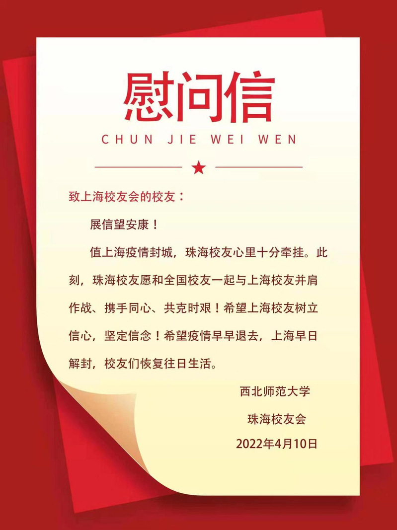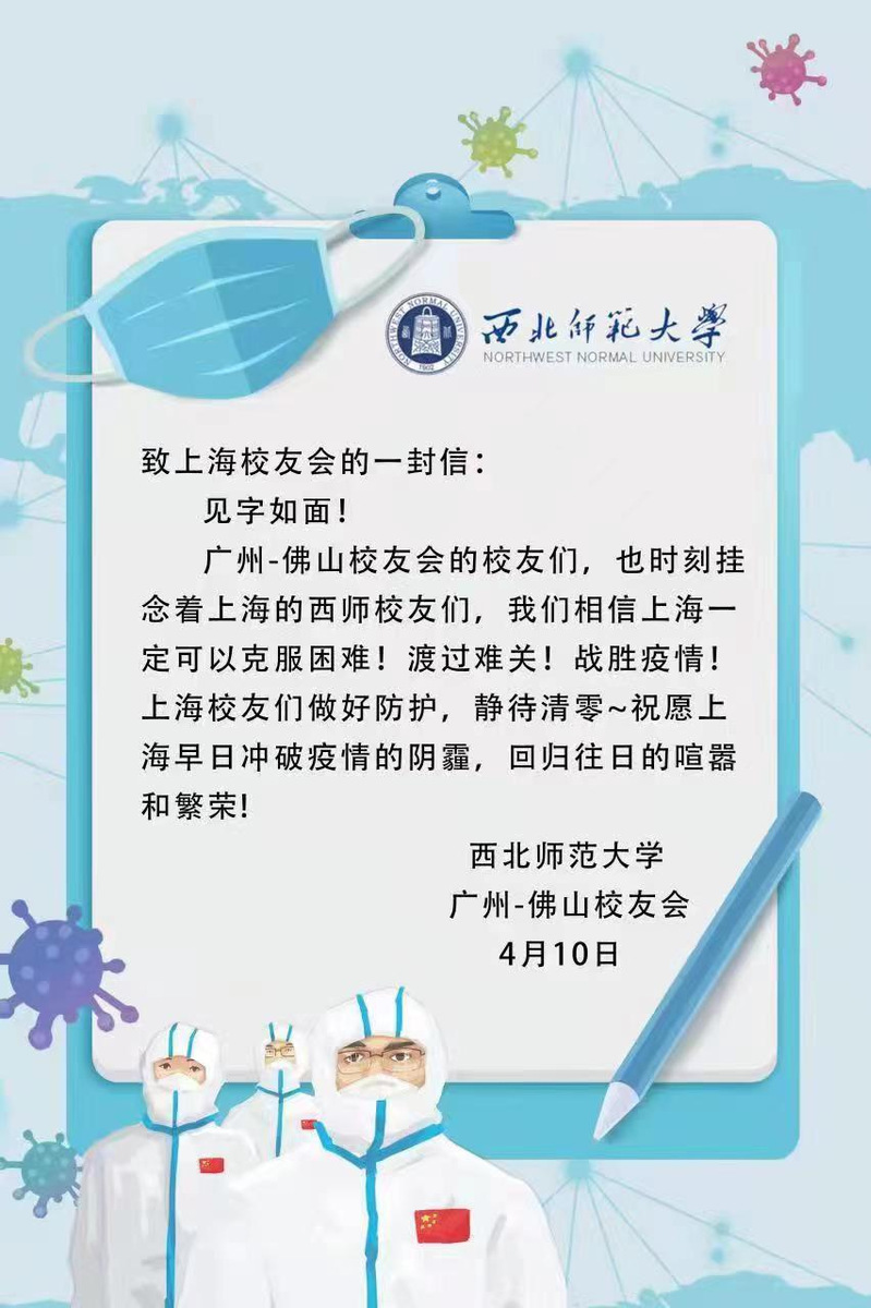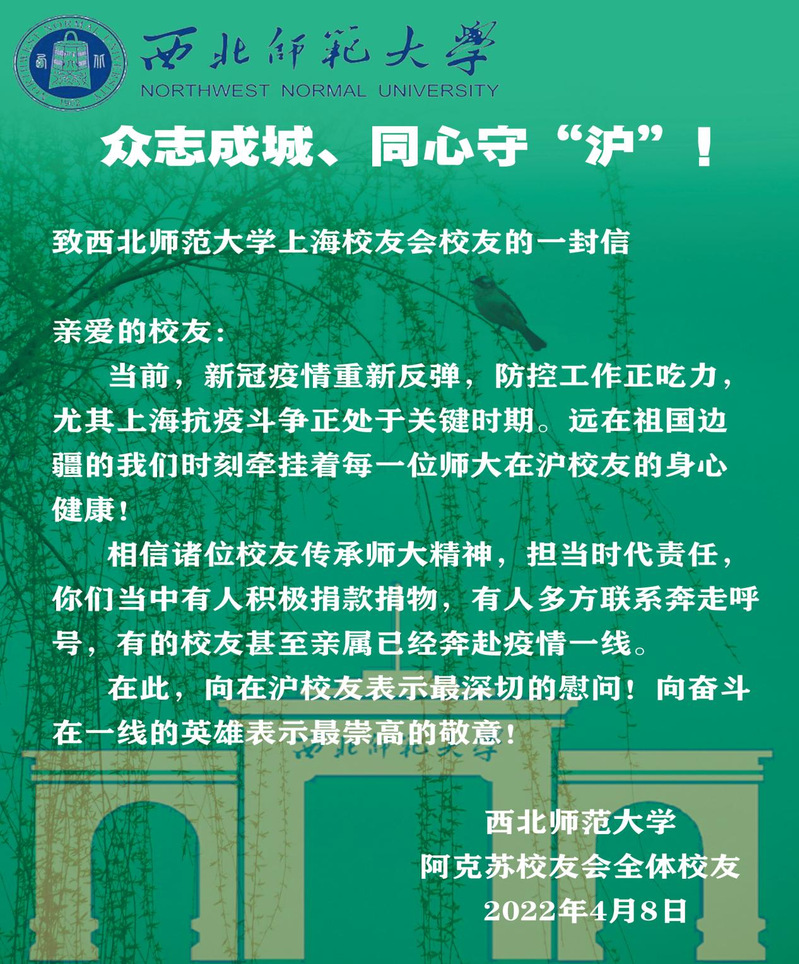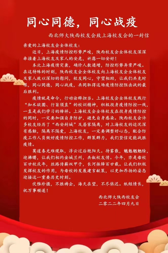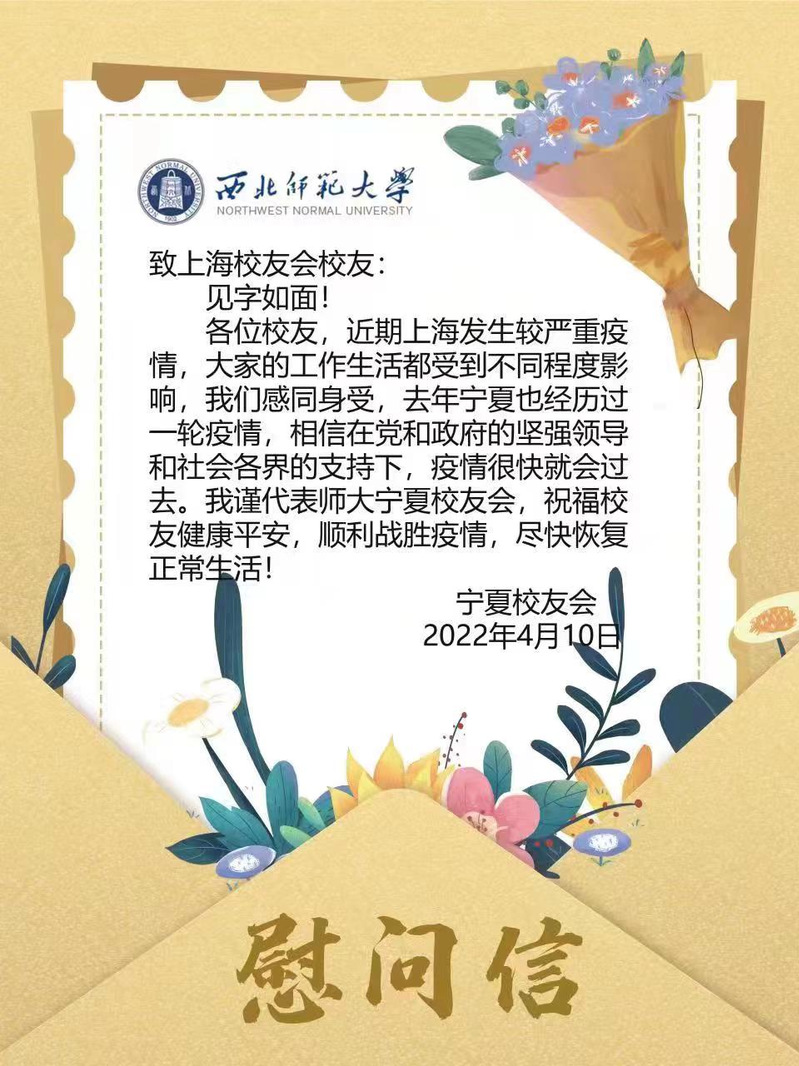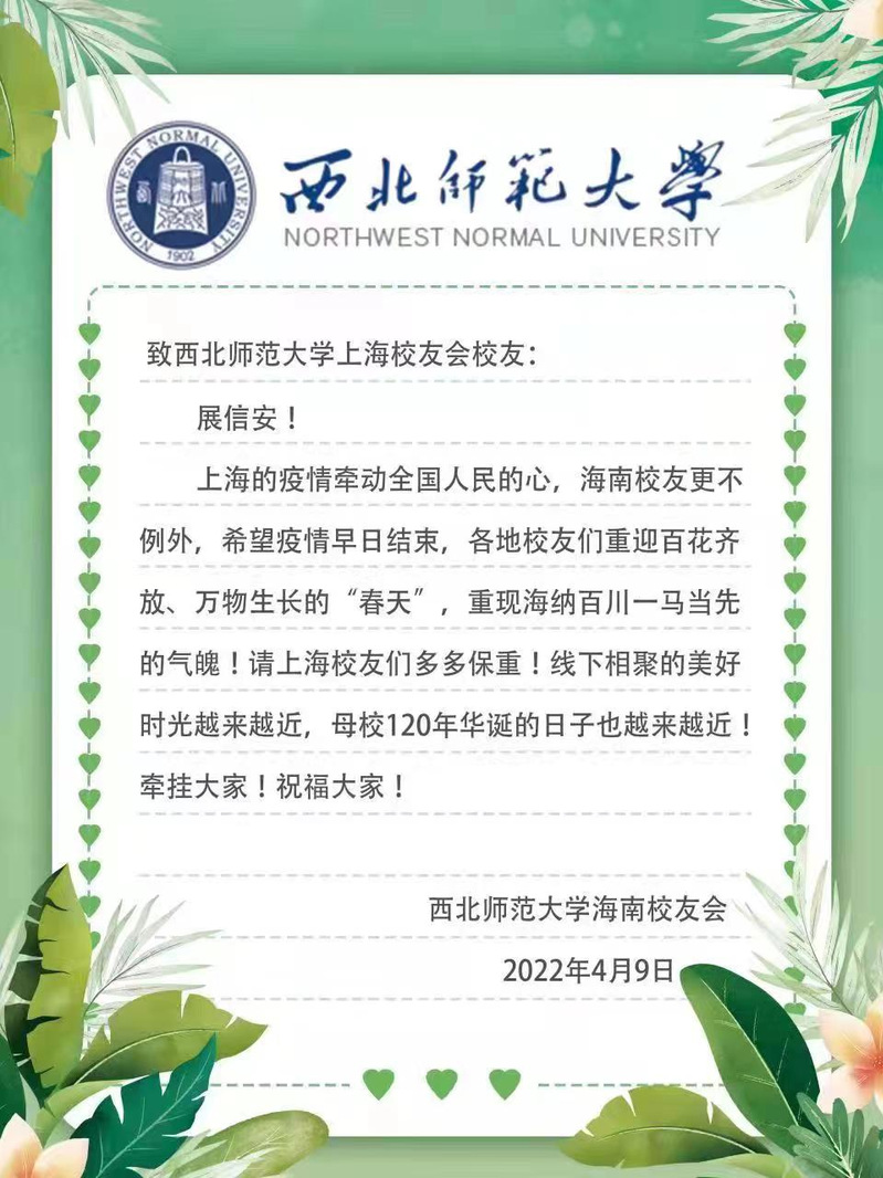 三月以来,上海疫情形势异常严峻,在沪西师人身心健康一直是身处祖国各地西北师大人心中的牵挂。近日,西北师大社会合作服务处(校友会)及学校北京、天津、广州-佛山、深圳、珠海、海南、宁夏、新疆阿克苏、江苏、四川、陕西、贵州、浙江、张掖等地校友会纷纷给上海校友会发信慰问,表达了对在沪西师人的关心、慰问和鼓励,带去了母校的关怀和惦记,带去了全体校友的关心和牵挂。