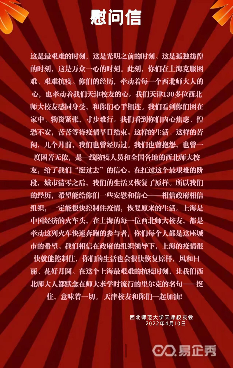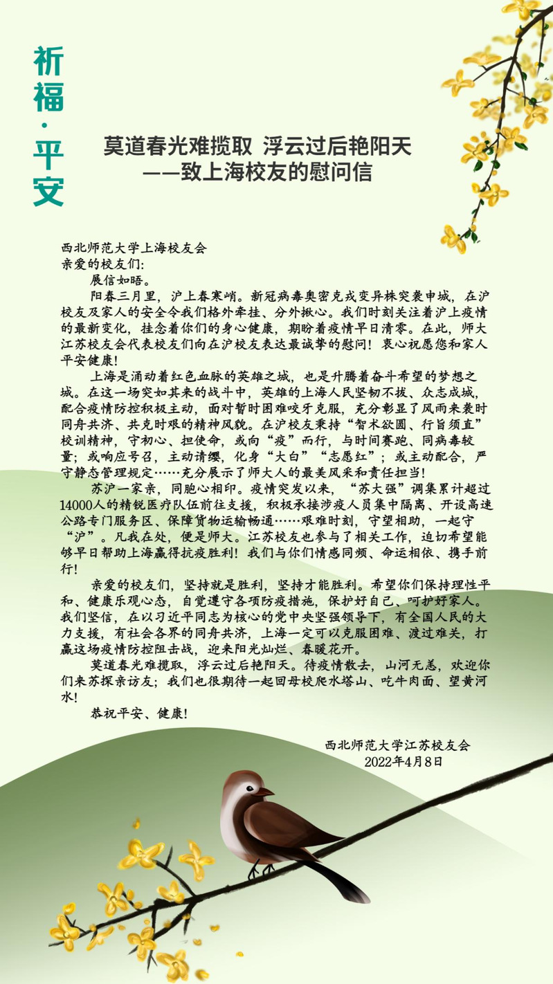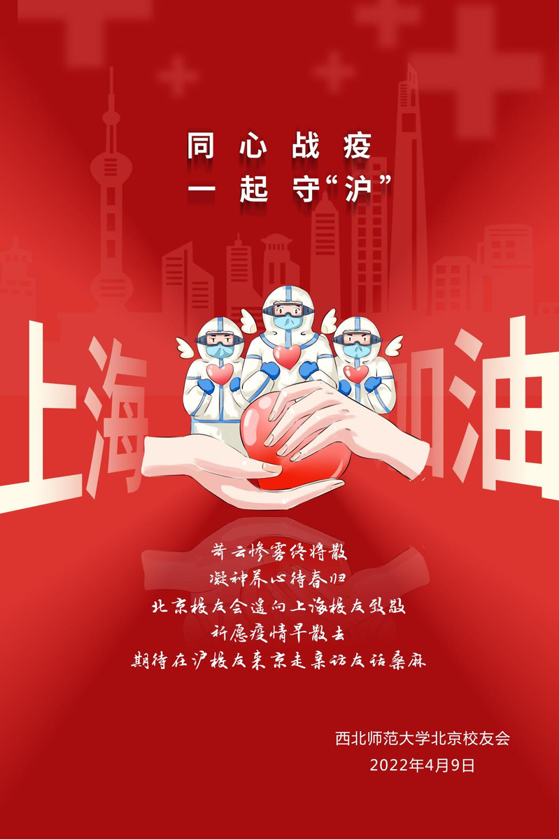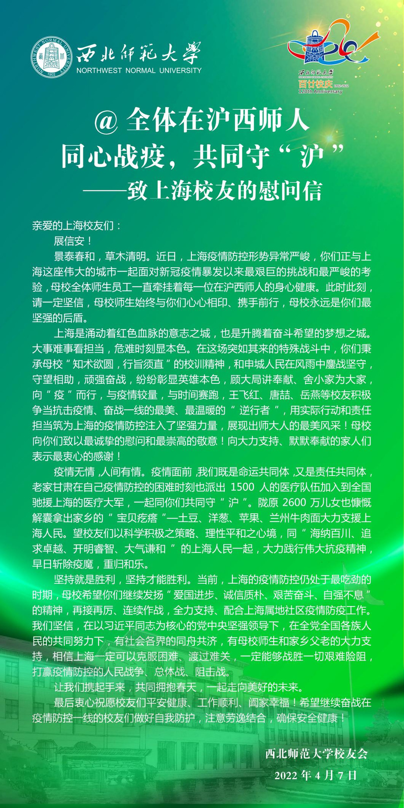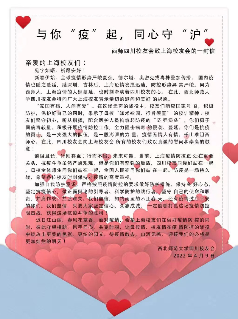 三月以来,上海疫情形势异常严峻,在沪西师人身心健康一直是身处祖国各地西北师大人心中的牵挂。近日,西北师大社会合作服务处(校友会)及学校北京、天津、广州-佛山、深圳、珠海、海南、宁夏、新疆阿克苏、江苏、四川、陕西、贵州、浙江、张掖等地校友会纷纷给上海校友会发信慰问,表达了对在沪西师人的关心、慰问和鼓励,带去了母校的关怀和惦记,带去了全体校友的关心和牵挂。
