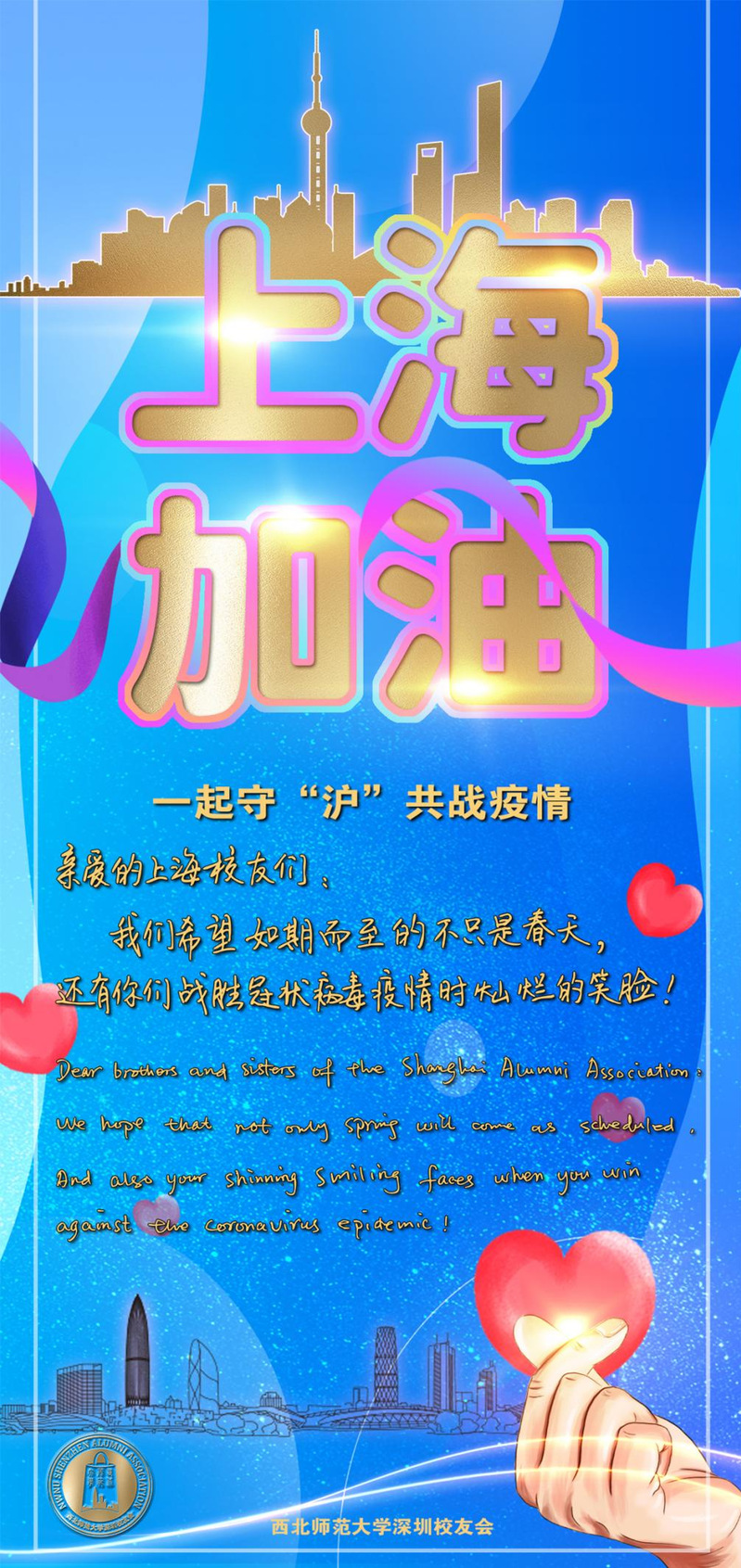 上海校友会对来自各地校友的慰问和关心表示由衷的感谢,感谢大家予上海校友们力量、决心和信心,坚信此次疫情防控阻击战体上海人民的共同努力和校友们的大力支持下定能取得最终胜利。