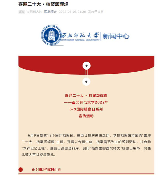 此外,学校相关部门还正式启动了“木铎记忆”人物口述史工程,建设口述档案资料库,编印“档案里的西北师大”校史口袋书,印制校庆120周年纪念邮册,开展校庆专题档案展览等一系列档案文化活动,让档案见证历史,让历史照亮未来,向学校120周年校庆献礼。