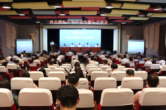 为全面总结、表彰2021年毕业生就业工作、进一步推进2022年毕业生高质量就业,及早谋划2023届毕业生就业工作,6月10日下午,西北师大召开毕业生就业工作会。党委书记张俊宗、校长刘仲奎出席会议并讲话;党委常委、副校长董晨钟,党委常委、党委统战部部长、副校长韩高年出席会议,党委常委、党委宣传部部长、副校长邓小娟主持会议;学校就业创业工作领导小组各成员单位负责人,各学院党政负责人、副书记、辅导员等140余人参加会议。