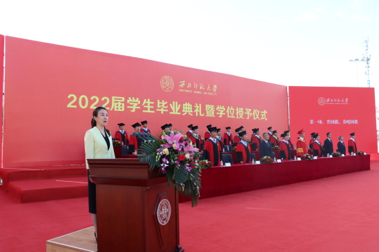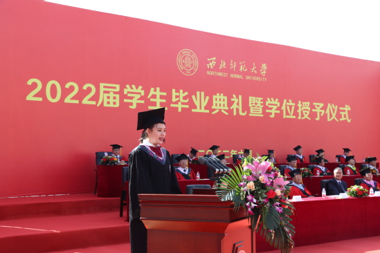 毕业生代表、外国语学院本科生毛雨鑫在发言中表示,四年的学习实践中,我们一次次的深切感受着母校校训“知术欲圆、行旨须直”蕴含的至真哲理和无限滋养,在母校丰厚的文化滋养下,每一天的大学生活,都让我们在“时不我待”中努力成为那个最好的自己。“桃李不言,下自成蹊。”从这里出发,我们永远会把西北师大精神作为终身恪守的准则,在将来的岗位上,为母校增光添彩,为祖国的建设奉献自己的青春力量。