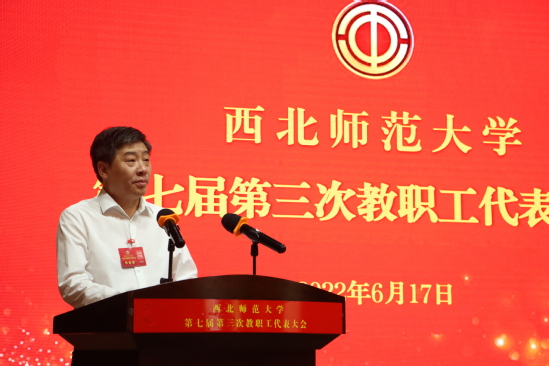 张俊宗强调,2022年是全面建设社会主义现代化国家、向第二个百年奋斗目标进军的重要一年,也是全面迈进“十四五”、喜迎党的二十大的重要一年,对照国家“双一流”建设标准,机遇与挑战并存。面对新形势新任务新挑战,全校上下要切实增强政治意识,坚定不移地用习近平新时代中国特色社会主义思想统领工作全局,深刻领会“两个确立”的决定性意义,增强“四个意识”、坚定“四个自信”、坚决做到“两个维护”,带着责任、立足实际、联系工作,深入学习贯彻习近平总书记关于教育的重要论述,自觉对标中央和教育部要求,以“人一之我十之,人十之我百之”的甘肃精神,传承学校120年优良的办学传统,担负起扎根中国大地建设一流大学的光荣使命。要切实增强使命意识,树立高远的理想追求和深沉的家国情怀,以主人翁的姿态解放思想、立足岗位、勤勉工作;各位代表要进一步增强履行使命的政治自觉、思想自觉和行动自觉,更好地发挥联系教职工、服务教职工的作用,为学校改革发展凝聚起强大的合力。要切实增强实干意识,以争先创优、不甘落后的劲头真抓实抓、苦干实干,努力创造新的业绩;要主动把握高等教育改革发展的新形势、新任务、新要求,主动挑担子、勇于担责任,关键时刻站得起来、重要关头豁得出去,形成人人有机会、人人想干事、人人能干事的浓郁氛围,在干事创业中创造辉煌业绩,实现人生价值。要切实增强服务意识,不断加强工会自身建设,积极探索和实践具有时代特色、符合人才发展规律、有助于促进人的全面发展、为教职工乐于接受的运作机制和工作方式,依靠校院两级群团组织,推动党的路线方针政策在师生员工中的贯彻落实,推动学校党委决策部署变成师生员工的自觉行动,不断开创工会工作新局面,切实将师生员工的力量和智慧,引导凝聚到学校中心工作上来,以实际行动为实现建设一流大学目标做出积极贡献!