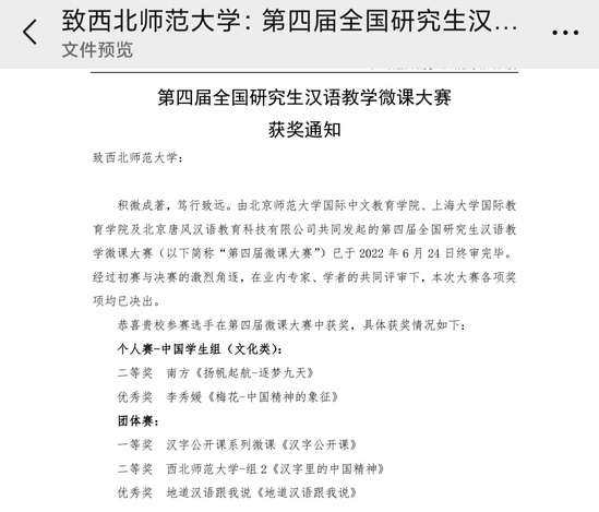近日,由北京师范大学、上海大学、北京唐风汉语教育科技有限公司承办的第四届全国研究生汉语教学微课大赛落幕,日韩人妻无码一区二区三区久久99_日韩精品一区二区三区中文在线_无码日韩精品一区二区免费_久久久91精品国产一区二区三区_亚洲精品久久久一区黄无码_国产91精品一区二区麻豆网站_成人国内精品久久久久影院汉语国际教育专业硕士研究生在此次微课大赛中表现出色、成绩喜人,荣获团体赛一、二等奖,优秀奖;个人赛二等奖,优秀奖;国际文化交流学院获“优秀组织单位”奖。