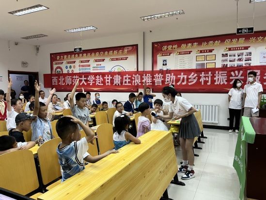 初等教育学院“关爱留守雏鹰助力乡村教育”实践团在陇南徽县聚焦农村留守儿童学前教育,开展防溺水安全教育、“童心向党”主题环境创设及进村入户“送课上门”等活动,受到当地部分中小学生的热捧。敦煌学院、化学化工学院、旅游学院、音乐学院、阳光服务社组织的教育关爱服务团在陕西、山东、河北、安徽、甘肃等地,通过结对帮扶、特色夏令营、实地调研等形式,对乡村少年儿童进行情感关怀、励志教育,打通了关心关爱少年儿童的“最后一公里”。