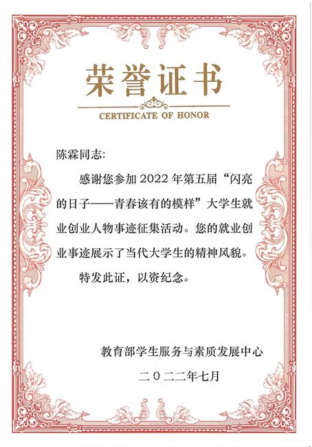 日前,教育部学生服务与素质发展中心主办的2022年第五届闪亮的日子——青春该有的模样大学生就业创业人物事迹征集活动评选结束,由西北师大推荐的毕业生陈霖获评2022年全国大学生就业创业人物先进典型,展示了我校大学生的精神风貌。