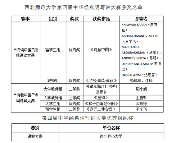 近日,中华经典诵写讲大赛组委会公布了第四届中华经典诵写讲大赛的获奖名单。西北师大师生的作品在全国决赛中取得优异成绩,在“诵读中国”经典诵读大赛、“诗教中国”诗词讲解大赛中获得7项奖项,其中二等奖2项、三等奖1项、优秀奖3项、优秀组织奖1项。我校连续参加四届比赛,本届比赛是学校目前获得奖项最多的一届。