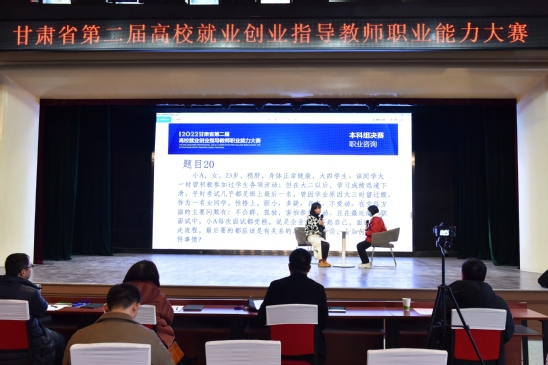 本次大赛分为本科组与高职组两个组别,赛程含初赛和决赛两个赛段。17日的初赛针对就业创业指导教师对相关知识的掌握程度以及理解分析信息和解决问题的能力,采用闭卷笔试的形式进行考察。经过初赛,本科组21名选手,高职高专组28名选手进入18日现场决赛环节。决赛主要考察就业指导教师的职业咨询技术、解决学生实际就业创业问题的能力以及对职业生涯规划理论与就业指导相关政策的掌握程度、理解应用能力、校本化课程设计与教学技巧展示等。进入决赛的选手通过现场抽签方式决定比赛顺序,现场抽题限时对就业创业相关问题提出咨询解决方案,随后对课程和教学技巧进行展示。经过一天的激烈角逐,大赛落下帷幕。至此,由我校承办的甘肃省2022年第三届高校就业创业课程案例设计大赛和甘肃省第三届高校毕业生就业创业故事征文大赛等三项就业创业赛事全部以高质量、高标准顺利完成,比赛结果将由省教育厅近日公布。