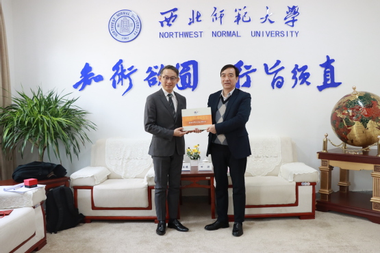 田澍对蔡佳麟一行来校交流表示欢迎,介绍了西北师大办学特色以及甘肃省历史人文和经济社会发展情况,表示多年来两校在学生互派研修、教师互访、文化体验等方面合作成果丰硕,希望结合双方各自办学优势和特色,进一步拓展合作空间,为深化校际交流搭建更多平台。