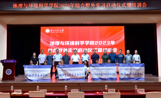 教务处负责人为参加此次综合野外实习的四个分队授旗。地理与环境科学学院负责人介绍了本次综合野外实习的基本情况并做了详细安排,从实习的目的意义、基本要求及注意事项等方面对2023年参加综合野外实习的师生进行了集体培训;各带队教师组织实习学生进行了分专业培训。